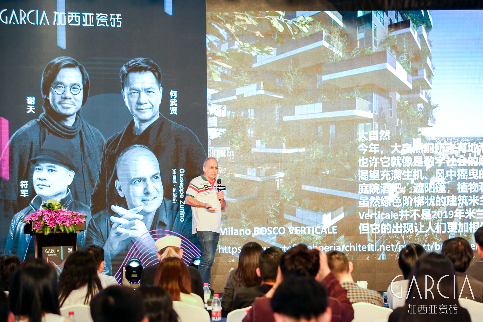加西亚瓷砖创意总监、意大利瓷砖知名策展人 Giuseppe Zunino(朱塞佩•祖尼诺先生);山隐建筑创办人、中国科技大学室内设计系兼任副教授 何武贤先生;中国美术院副教授、浙江亚夏设计研究院院长 谢天先生;澳门国际设计联合会会长兼理事长、澳门国际设计联展组委会主席 符军先生;加西亚瓷砖市场部总监 高玉清女士;杭州瑞德建材有限公司总经理 李建林先生;杭州加西亚瓷砖品牌营销总经理 林万辉先生等多位嘉宾与领导,及400多位杭州本土知名设计师共同参与了这场由加西亚瓷砖打造的VIP跨国设计交流论坛。